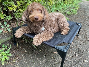 キャンプ用の椅子は軽くて不安定なことが多いため、ワンコが飛び乗ることでバランスを崩し、転倒してしまうことがあります。写真のような専用コットで、椅子以外にワンコの場所を作ってあげると安全対策にもなるのでオススメです。