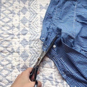 ちょうど良さそうなシャツを見つけたら、チョキチョキと襟元を切っていきます。
