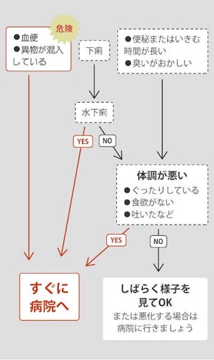 上記のチャートを参考に、今すぐ病院に行くべきかチェックしてみてください。当日の診療時間内の受診が必要かどうかは、うんちの変化だけでなく、ぐったりしている、食欲がないなどの全身症状の様子もみて判断することが大切です。