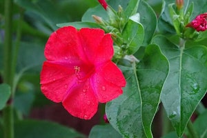 真っ黒な種をつぶすと白い粉が出てくる、オシロイバナ。道端にもよく咲いている雑草なので、お散歩時は気をつけましょう。