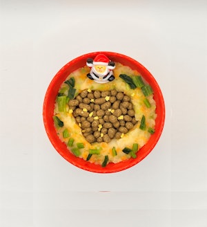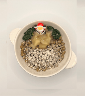 - 中央の窪み部分にドライフードを盛り付け、最後に刻んだほうれん草、ドライマンゴークランチなど彩りある食材をトッピングして完成です。